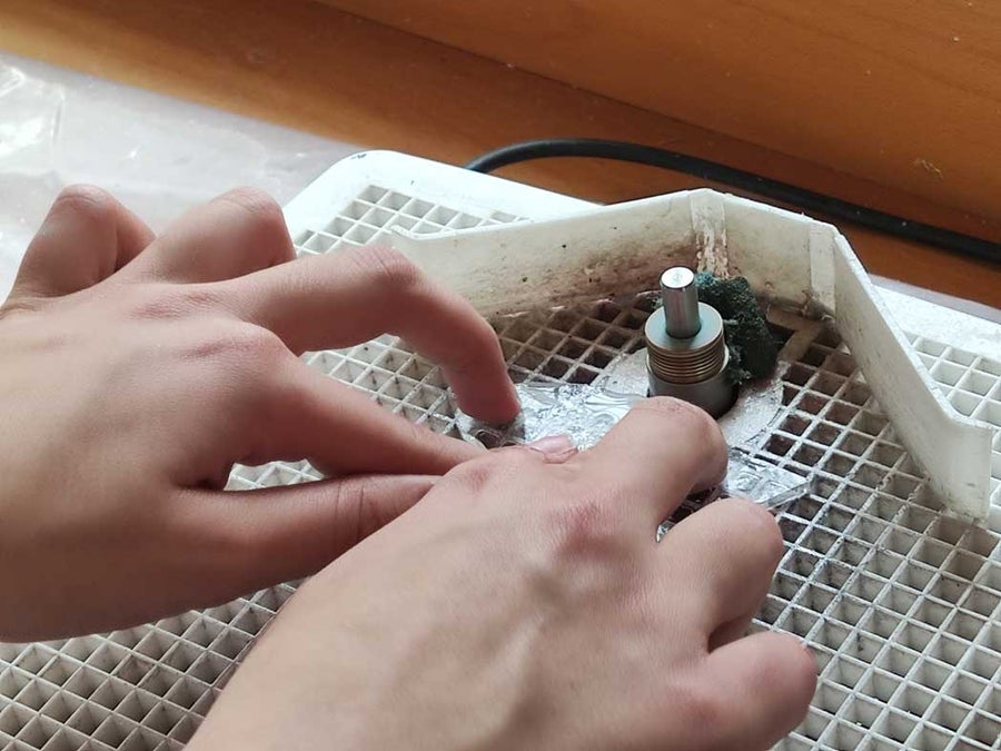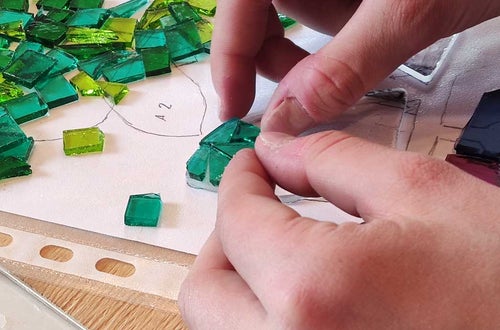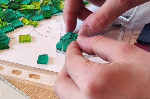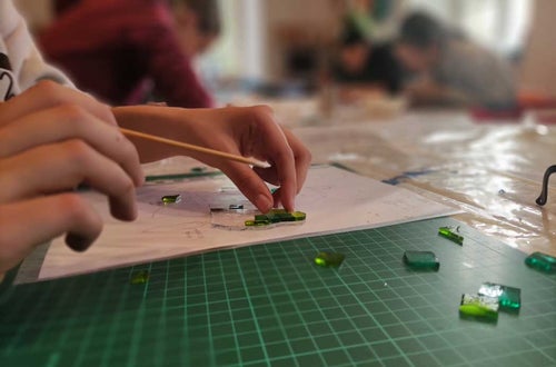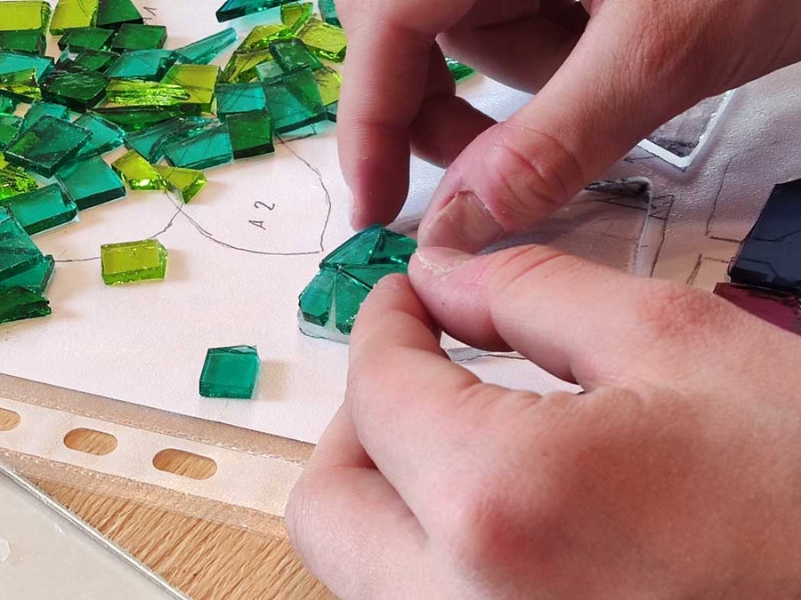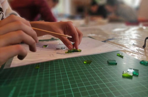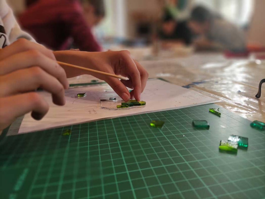 Nach einer kurzen Einführung in die Technik des Glasfusings und dem richtigen Umgang mit Glasschneider, Zangen und Schleifmaschine konnten die Schüller*innen der 1. und 2. Klasse im Praxisunterricht ihr eignes Kunstwerk gestalten. Es wurden verschiedene Glasteile passgenau zugeschnitten, zurechtgeschliffen, aneinandergereiht und angeklebt.