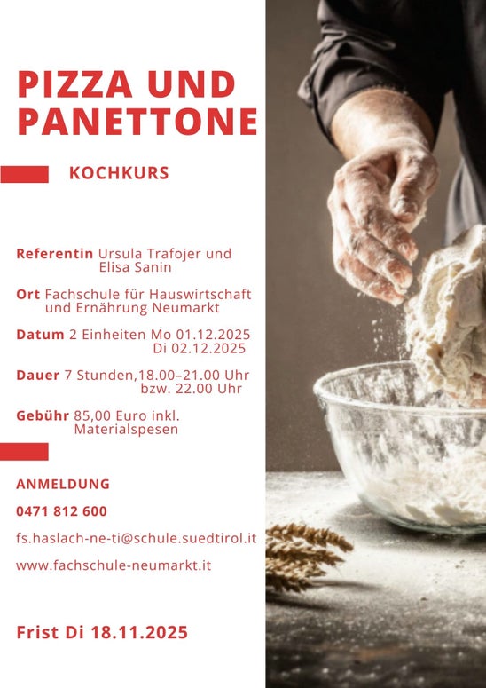 Kochkurs Pizza und Panettone 13.11.2025 | Aktuelles Anmeldefrist: 18.11.2025 Anmeldung unter 0471 812 600 oder fs.haslach-ne-ti@schule.suedtirol.it