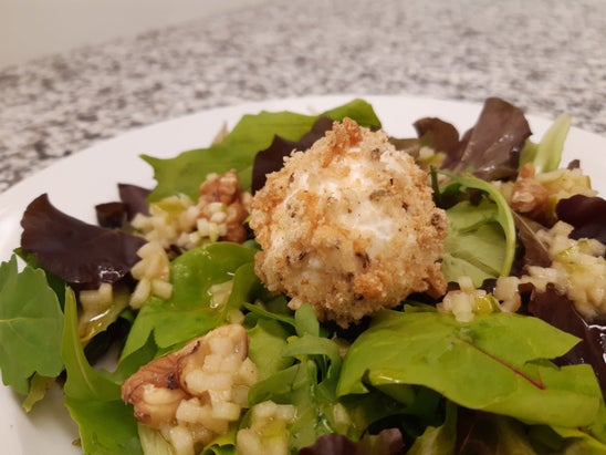 Ziegenfrischkäsepraline auf winterlichen Blattsalaten mit Apfelvinaigrette und getoasteten Walnüssen